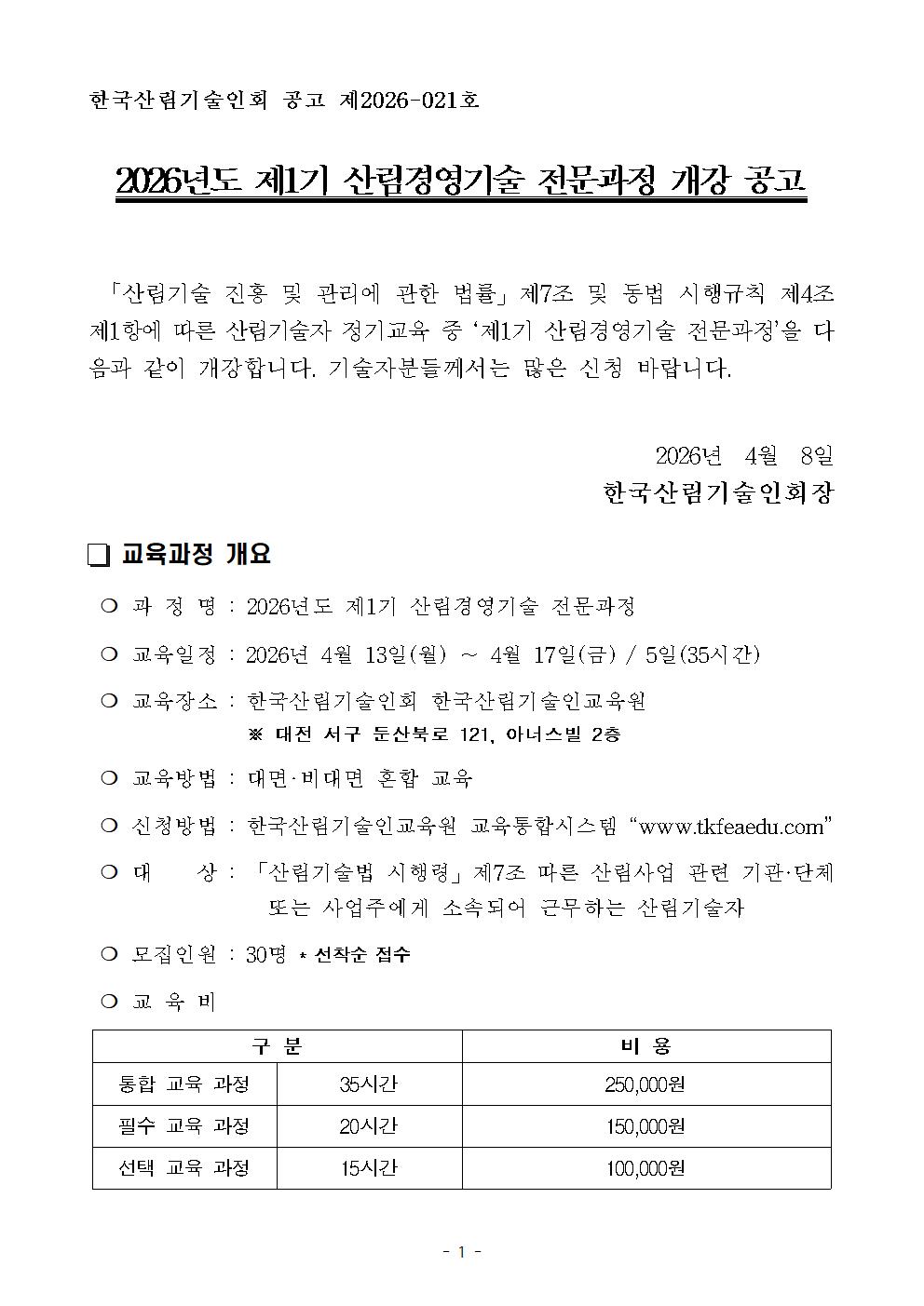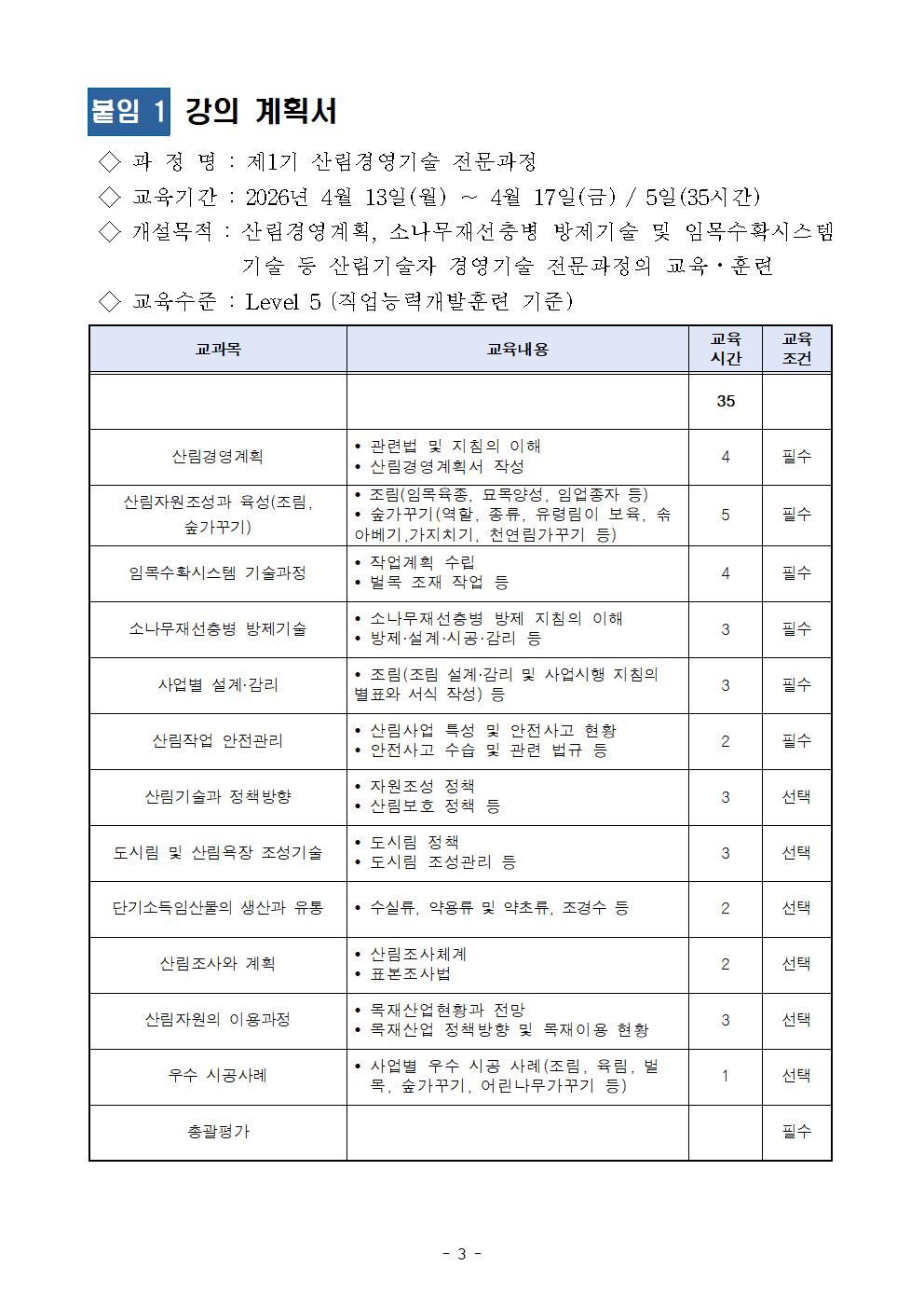 [제2026-020호] 제1기 산림경영기술 전문과정 개강 공고