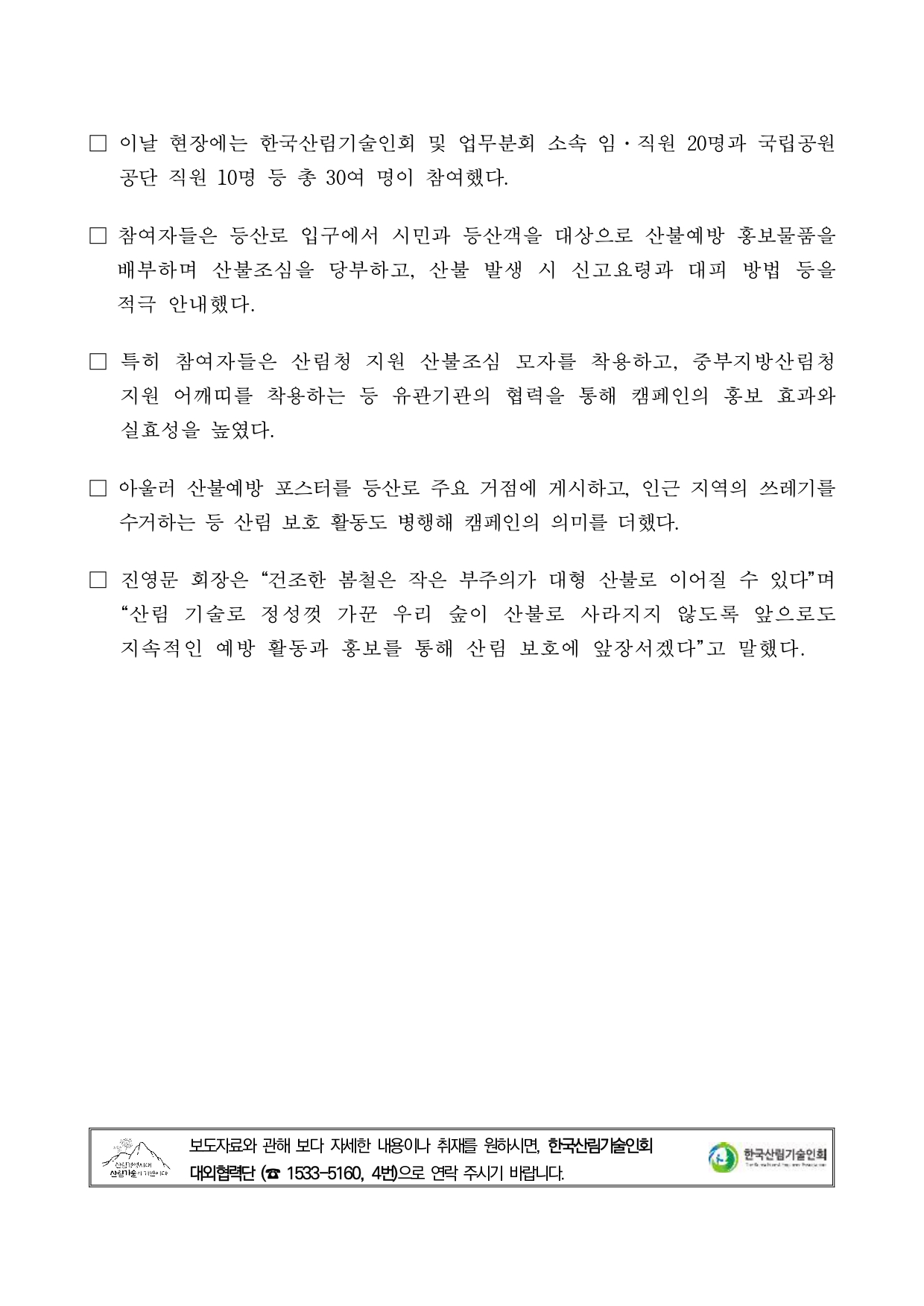 □ 진영문 회장은 “건조한 봄철은 작은 부주의가 대형 산불로 이어질 수 있다”며 “산림 기술로 정성껏 가꾼 우리 숲이 산불로 사라지지 않도록 앞으로도 지속적인 예방 활동과 홍보를 통해 산림 보호에 앞장서겠다”고 말했다.