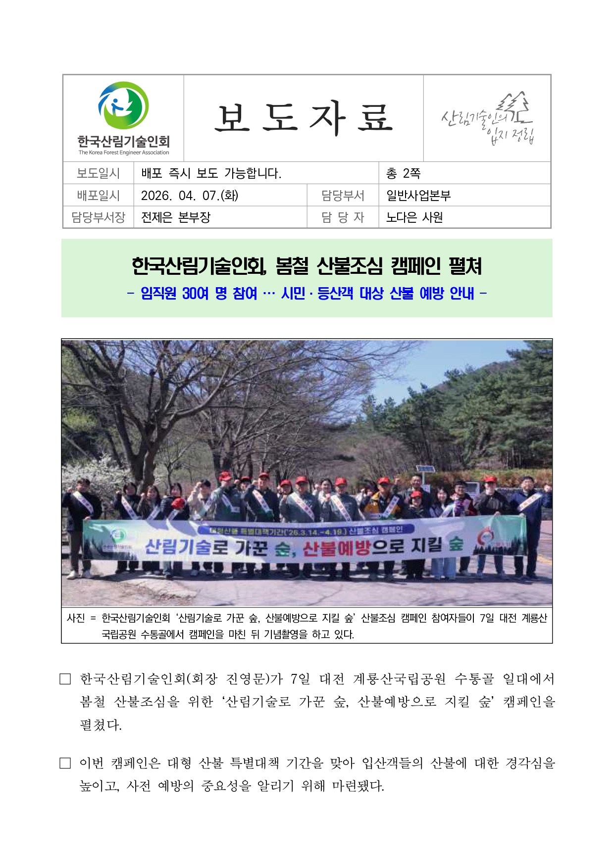 □ 한국산림기술인회(회장 진영문)가 7일 대전 계룡산국립공원 수통골 일대에서 봄철 산불조심을 위한 ‘산림기술로 가꾼 숲, 산불예방으로 지킬 숲’ 캠페인을 펼쳤다.
